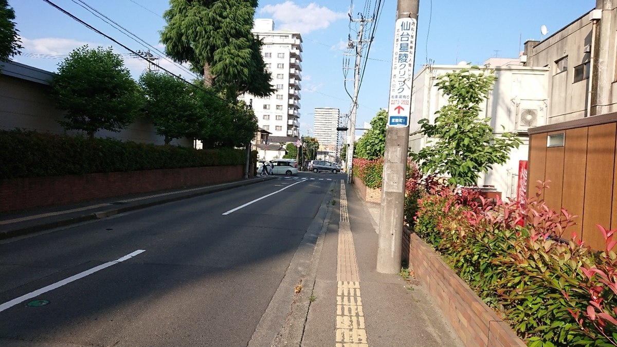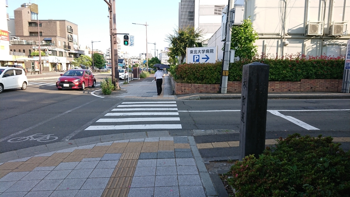 北山覚範前から数えて九丁目の、北一番丁で木町に続いた。角には阿倍、吉須など三百石の武士、北八番丁以北にはお足軽 が住んだ。明治以降北四番丁東南角に小学校ができた。四丁目以南西側に旧制二中、宮城病院ができたが今は大学病院構内となっている。